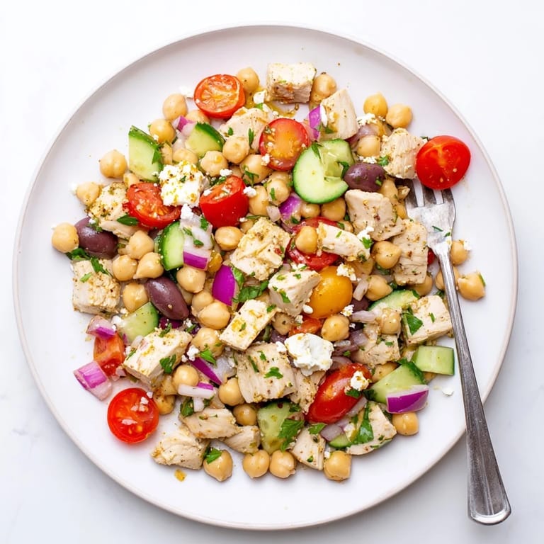 Grilled shrimp, baked cod, or shredded turkey make excellent seafood alternatives. For vegetarian options, double the chickpeas, add white beans, or incorporate quinoa for extra protein while maintaining the Mediterranean profile.